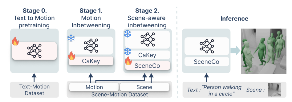 we introduce SceneAdapt, a framework that injects scene awareness into text-conditioned motion models by leveraging disjoint scene–motion and text–motion datasets through two adaptation stages: inbetweening and scene-aware inbetweening.